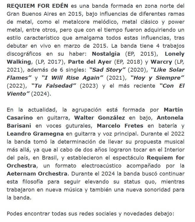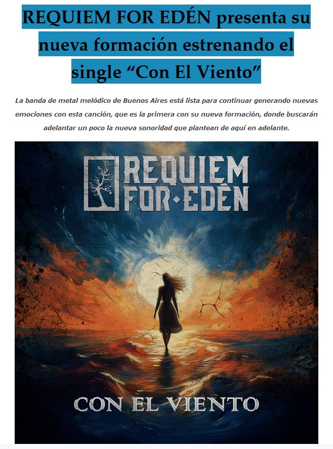 La banda argentina de metal Requiem For Edén está presentando el simple “Con el viento”. Para la ocasión aprovechan a introducir la nueva formación de la agrupación. Compartimos la información y la música, a continuación.