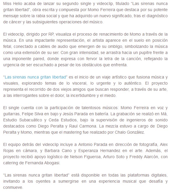 La banda chilena Miss Helio está presentando su nuevo tema, “Las sirenas nunca gritan libertad”. Es una gran canción rockera, cuyo estreno acompañan con un video. Compartimos la información y la música, a continuación.