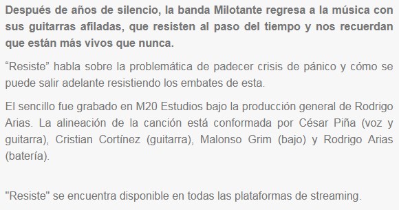 El sencillo “Resiste” de la banda chilena Milotante ya está disponible para ser escuchado. Un gran tema con un sonido impecable, al que recomendamos le presten oído mientras leen la información que compartimos.