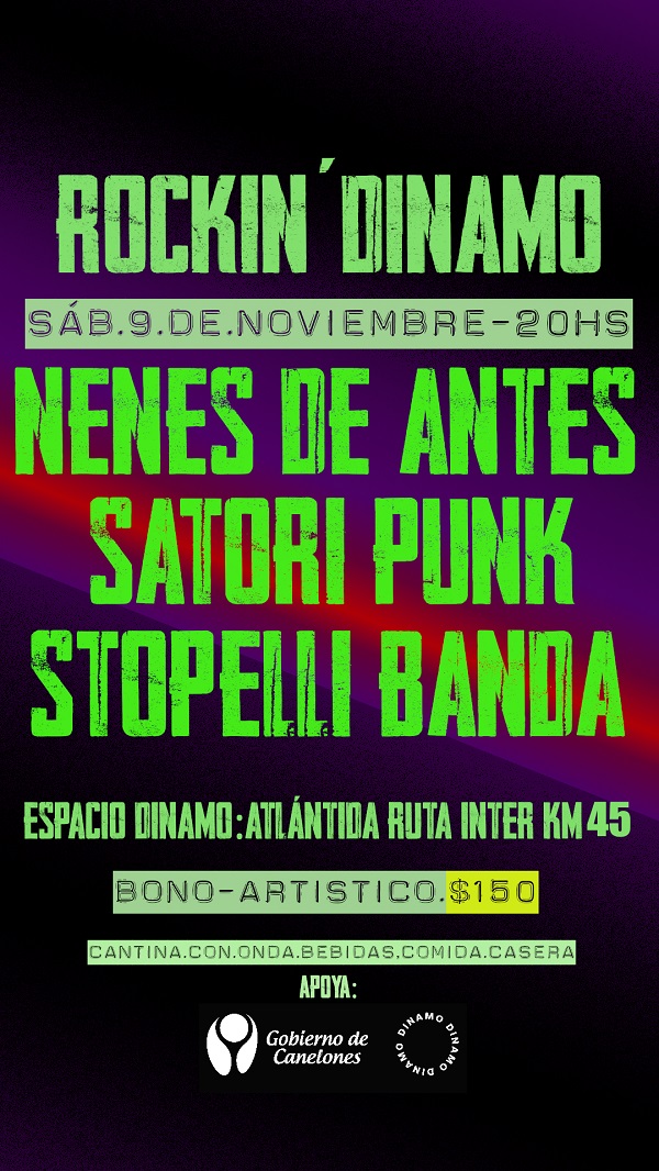 Rockin’ Dinamo es un show en vivo que se llevará a cabo el sábado 9 de noviembre a partir de las 20 horas en Espacio Dinamo (Km. 45 de la Ruta Interbalnearia). Participarán las bandas Nenes De Antes (banda tributo a Divididos), Satori Punk y Stopelli Banda. La entrada tiene un costo de $150, y habrá una cantina imperdible. ¡Rock, punk y funk para gozar!