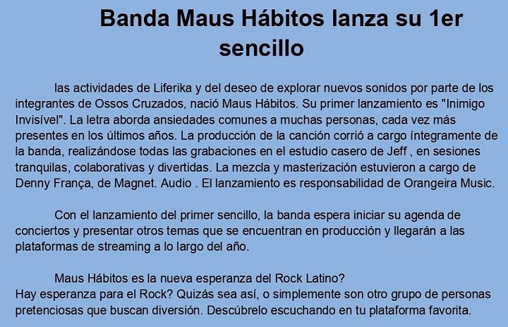 Una nueva banda brasileña se llega hasta Uruguay. Se trata de Maus Hábitos, que eligen su canción “Inimigo invisível” como tarjeta de presentación. La acompañan de un video, que compartimos junto a la información.