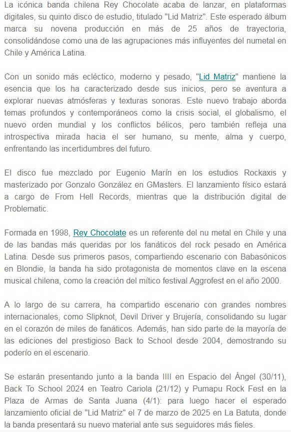 Rey Chocolate es una banda chilena que está lanzando su disco, llamado Lid Matriz. Está compuesto de 11 canciones llenas de rock, con un excelente sonido. Pueden escucharlo mientras leen la información que compartimos.