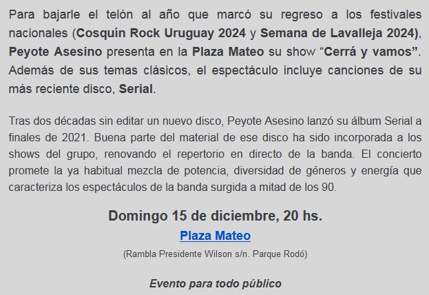 El Peyote Asesino cierra el año con su concierto Cerrá y Vamos, que se llevará a cabo en Plaza Mateo (Av. Sarmiento y Rambla Pte. Wilson) este 15 de diciembre. Estarán tocando canciones de todo su repertorio a partir de las 20 horas. Las entradas tienen un costo de $990 y ya están a la venta a través de Redtickets.