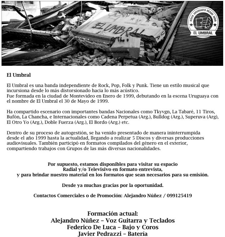El próximo sábado 14 de diciembre El Umbral se estará presentando en Midas (Av. Gral. Rondeau 1493) para festejar sus 25 años en la ruta del punk rock. La cita será a las 21 horas y la ocasión será aprovechada para grabar lo que será el primer disco en vivo de la banda.