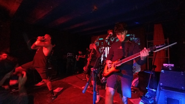 La cantidad de gente que había esa noche fue impresionante. El local Midas estaba que explotaba de gente. No soy muy bueno calculando multitudes, pero debía haber entre unas 250 y 10.000 personas (les dije que no soy bueno calculando). De todas formas, no es por desmerecer la cantidad, pero la onda que tenía el público era de primera. Desde la apertura con la banda oriunda de Young, Aguas Turbias, el público se plegó al espíritu festivo que sobrevolaba el ambiente y rápidamente contagió a todos los presentes. Apenas los pocos minutos que separaban la presentación de una banda de la siguiente, eran los instantes que había para recargar las baterías y retomar el agite y el pogo.