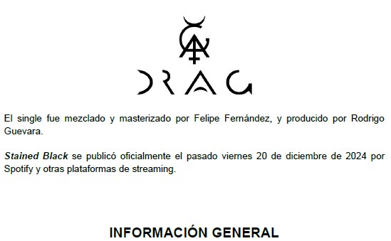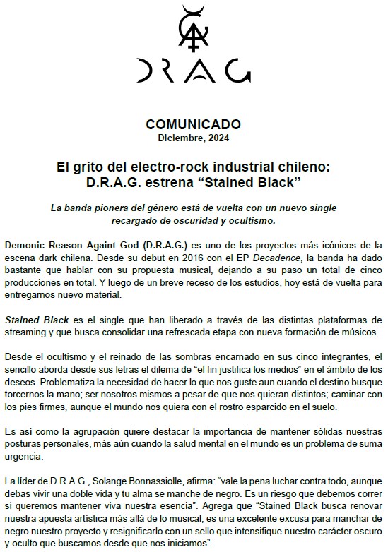 La banda chilena D.R.A.G. (Demonic Reason Against God) está presentando “Stained black”, que es su más reciente simple. Representantes de la movida dark de su país, llegan hasta nuestras costas con su música.