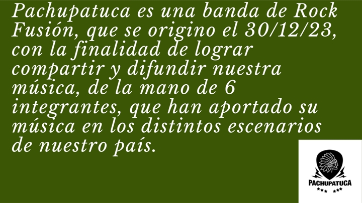 Pachupatuca es una banda de rock fusión, que se originó el 30 de diciembre de 2023, con la finalidad de lograr compartir y difundir nuestra música de la mano de seis integrantes, los que han aportado su música en los distintos escenarios de nuestro país.