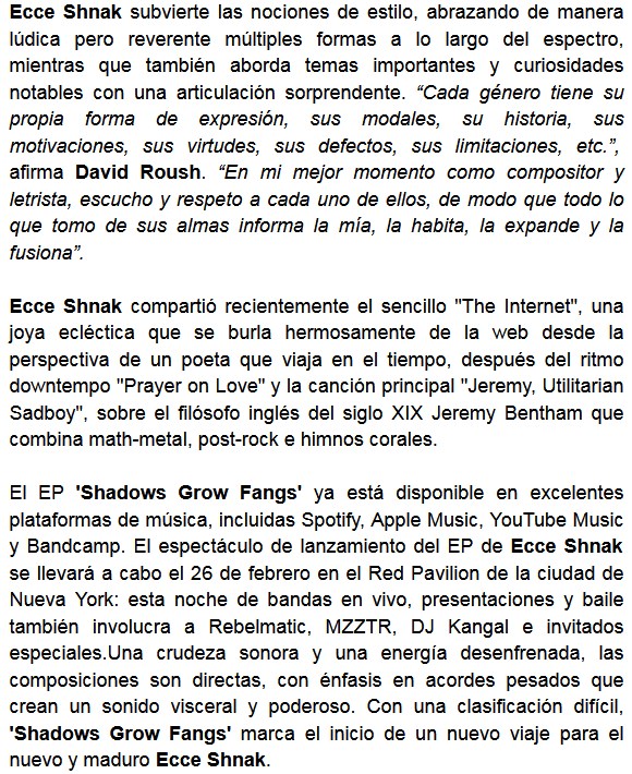 La banda estadounidense Ecce Shnak llega a las páginas de Sólo Rock Uruguay. Lo hacen con su recientemente editado EP de seis canciones y que han dado en llamar Shadows Grow Fangs. Compartimos la información y la música, a continuación.