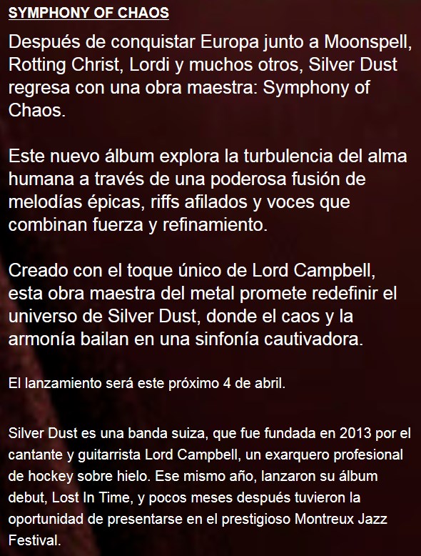 La banda Silver Dust proveniente de Suiza nos trae la edición de su nuevo álbum, denominado Symphony Of Chaos. A modo de presentación visual, lanzan el video de “Salve Regina”, que compartimos a continuación junto a toda la información.