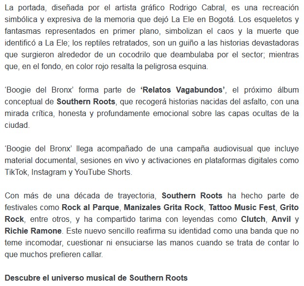 Southern Roots nos muestra cómo rockea un boogie con su última canción, “Boogie del Bronx”. La banda colombiana marca presencia en Sólo Rock Uruguay con este tema que suena impecable y que los invitamos a escuchar, mientras leen la información.