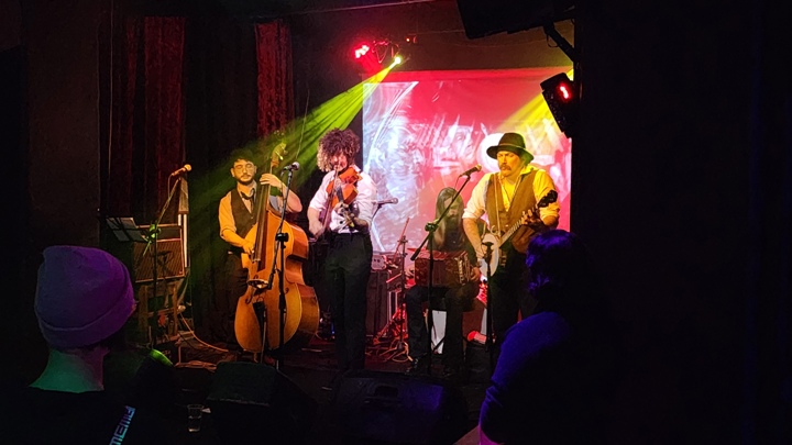 Abre el show uno de los canales de manifestación artística de Emanuel Piotto, su Piotto’s Folk Experiment. El cuarteto acústico compuesto de bandonéon, banjo, contrabajo y violín, encara temas propios y versiones, apropiándose de éstas últimas haciéndolas muy suyas. A pesar de que los mencionados instrumentos suelen estar por fuera de lo que es una propuesta de rock clásica, por decirlo de alguna manera, lo que la banda realiza sobre el escenario es una demostración de cómo el folk también puede ser rock. Sin estridencias y con una interpretación sentida y cálida, van llenando el espacio con una música cautivadora y potente. Sí, potente, porque así como lo cortés no quita lo valiente, lo acústico no quita lo potente. También puede decirse que suenan bastante más rock que algunas bandas electrificadas.