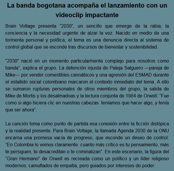 Brain Voltage lanza “2030”: una crítica sonora al control disfrazado de progreso
