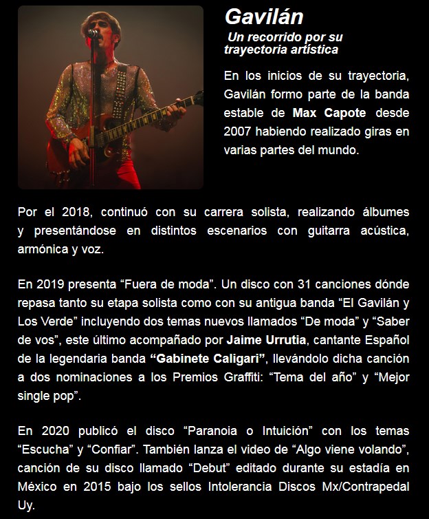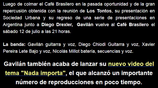 Luego de colmar el Café Brasilero en la pasada oportunidad y de la gran repercusión obtenida con la reunión de Los Tontos, su presentación en Sociedad Urbana y su regreso de una serie de presentaciones en Argentina junto a Diego Drexler, Gavilán vuelve al Café Brasilero el sábado 12 de julio a las 21 horas.