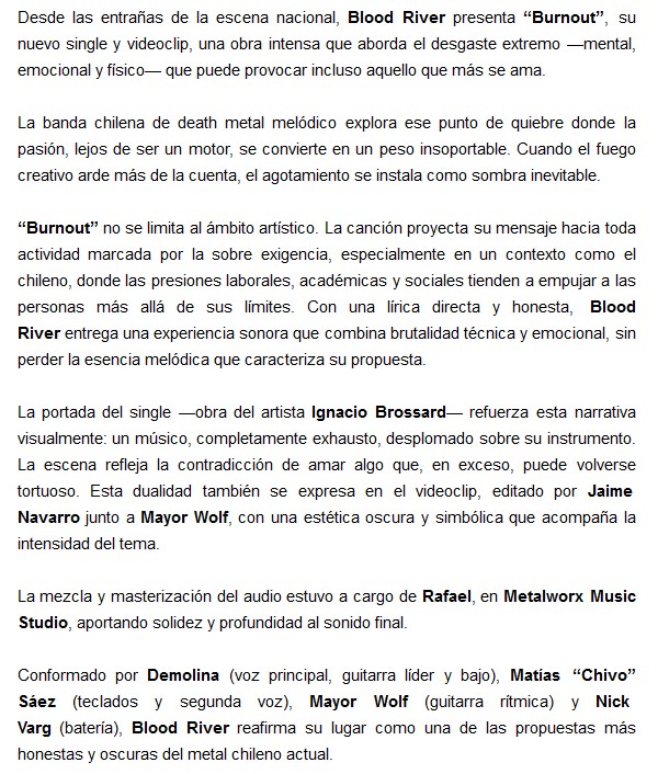 Otra poderosa banda chilena que llega a nuestras costas a través de Sólo Rock Uruguay. Se trata de Blood River, que está presentando su canción “Burn out” que ya está sonando. Además, cuenta con un video. Compartimos la información y la música.