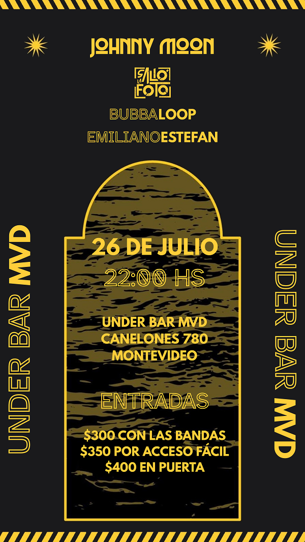 El 26 de julio a las 22:00 horas tocamos con Johnny Moon en Under Bar MVD. ¡¡Es muy importante para nosotros que estés ahí!! Nos acompañan tremendas bandas: Bubbaloop, Salió la foto y Emiliano Estefan.