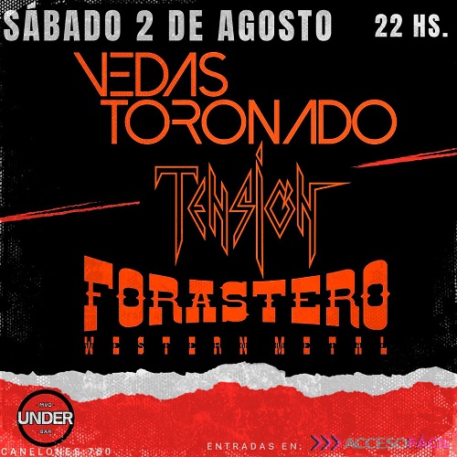 El sábado 2 de agosto se presentarán en Under Bar (Canelones 780) Vedas Toronado, Tensión y Forastero Western Metal. La cita es a las 22 horas.