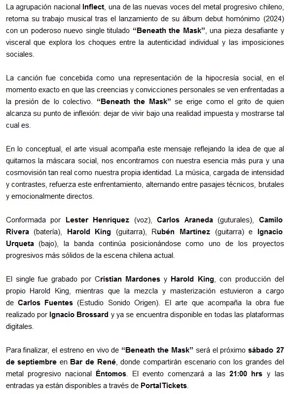 Desde Chile viene sonando la canción “Beneath the mask”. Es la banda chilena Inflect que está presentando su nuevo simple, lanzado a continuación de su álbum debut homónimo. Compartimos la información y la música.