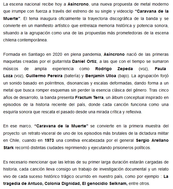 La banda chilena de metal Asíncrono está presentando su primer simple, llamado “Caravana de la muerte”, y que oficia de primer adelanto de lo que será su álbum debut. Acompañan el lanzamiento con un video. Compartimos.