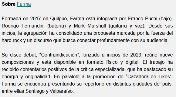 Un enérgico rock viene sonando desde Chile. Es la banda Farma, que está presentando su tercer simple de este 2025, llamado “Cazadora de likes”. Acompañan el lanzamiento con un video, el que compartimos junto a la información y la música.