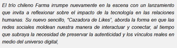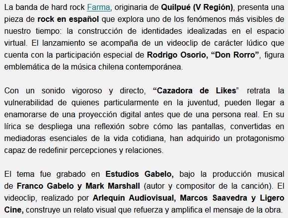 Un enérgico rock viene sonando desde Chile. Es la banda Farma, que está presentando su tercer simple de este 2025, llamado “Cazadora de likes”. Acompañan el lanzamiento con un video, el que compartimos junto a la información y la música.