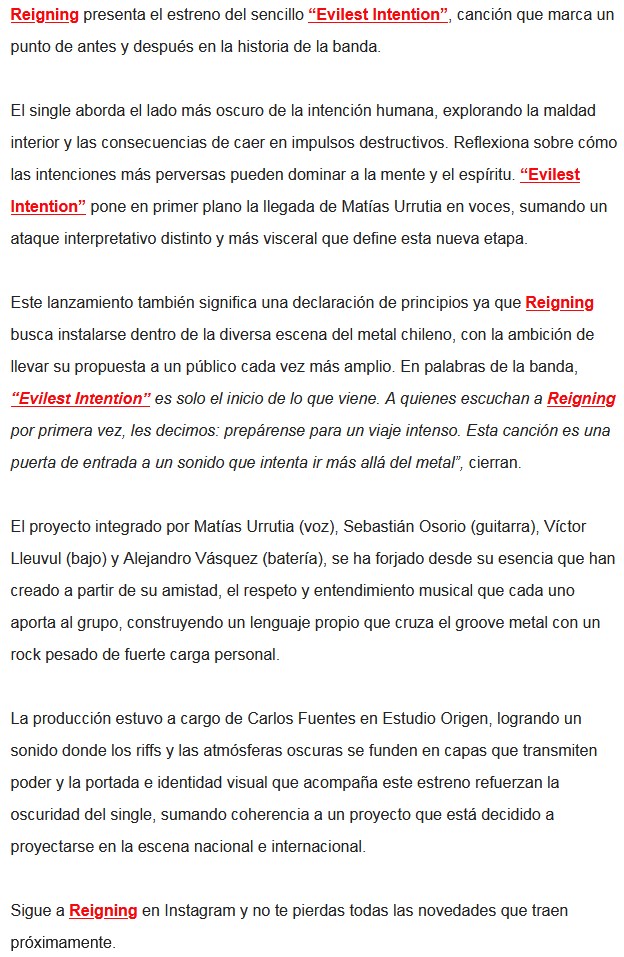 “Evilest intention” es el tema que la banda chilena Reigning está presentando en la actualidad. Oficia de punto de inflexión de la agrupación, el que implica el ingreso de un nuevo vocalista. Además habrá más cambios a nivel del sonido de la banda.