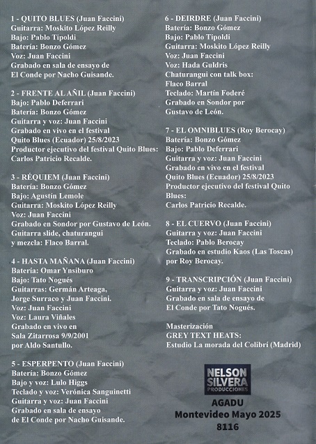 Entre las canciones presentadas figuran los clásicos “Frente al añil” y “El omniblues”, dos tremendos temas que además de poder apreciarlos, invitan a recorrer el resto del disco y descubrir otras grandes composiciones de El Conde. Un más que meritorio trabajo de Juan Faccini, que deja de manifiesto su poder rockero y su resiliencia. Un ejemplo a seguir.