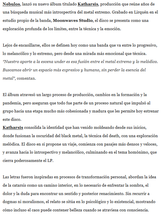 El metal chileno viene sonando hasta Sólo Rock Uruguay desde el sur del país. Lo trae Nebulos de la mano de la edición de su nuevo disco llamado Katharsis, al que ya pueden acceder para su escucha mientras leen la información que compartimos.