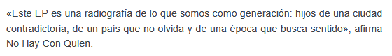 Más rock proveniente de Colombia. Esta vez está en manos de la banda No Hay Con Quien y su EP homónimo mostrarnos su música. Compuesto por seis canciones, el disco es una buena muestra de la propuesta de No Hay Con Quien. Lo escuchamos.