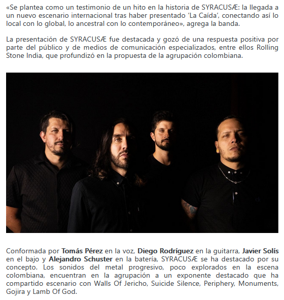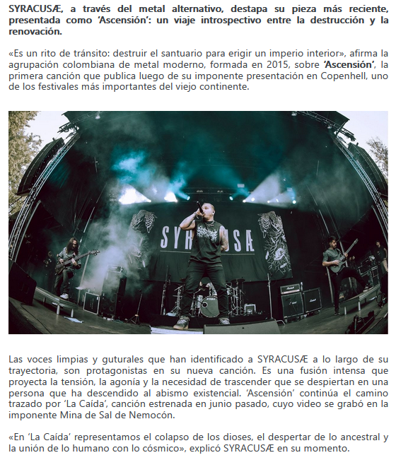 La banda colombiana Syracusæ llega a nuestro país a través de las páginas de Sólo Rock Uruguay. Lo hacen para presentar su nueva canción, que dieron en llamar “Ascensión”. Toda la potencia del metal colombiano en sus manos. Compruébenlo.