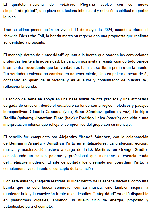 Más rock que sigue llegando de fuera de fronteras. Y es Chile quien sigue marcando presencia en nuestras páginas. Hoy es el caso de la banda Plegaria, que está presentando su nuevo simple llamado “Integridad”. Damos paso a la información y a la música.
