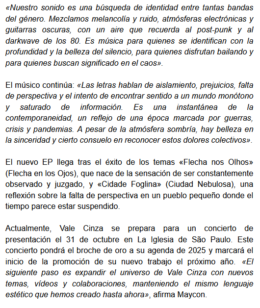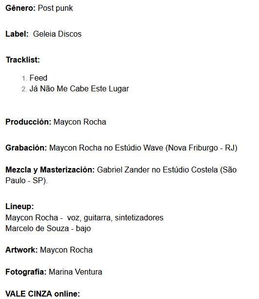 Vale Cinza es una banda brasileña que acaba de lanzar su EP Não Me Cabe Mais Esse Lugar, compuesto de dos canciones: la que le da el título y “Feed”. Los invitamos a descubrir su música, a continuación, mientras leen la información de la banda.