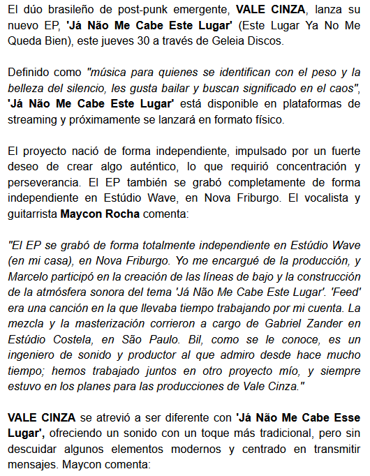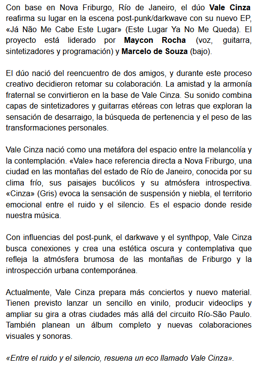 Vale Cinza es una banda brasileña que acaba de lanzar su EP Não Me Cabe Mais Esse Lugar, compuesto de dos canciones: la que le da el título y “Feed”. Los invitamos a descubrir su música, a continuación, mientras leen la información de la banda.
