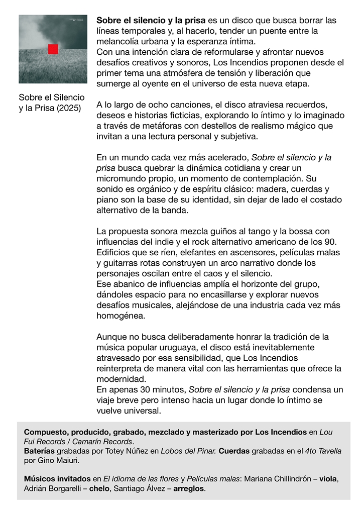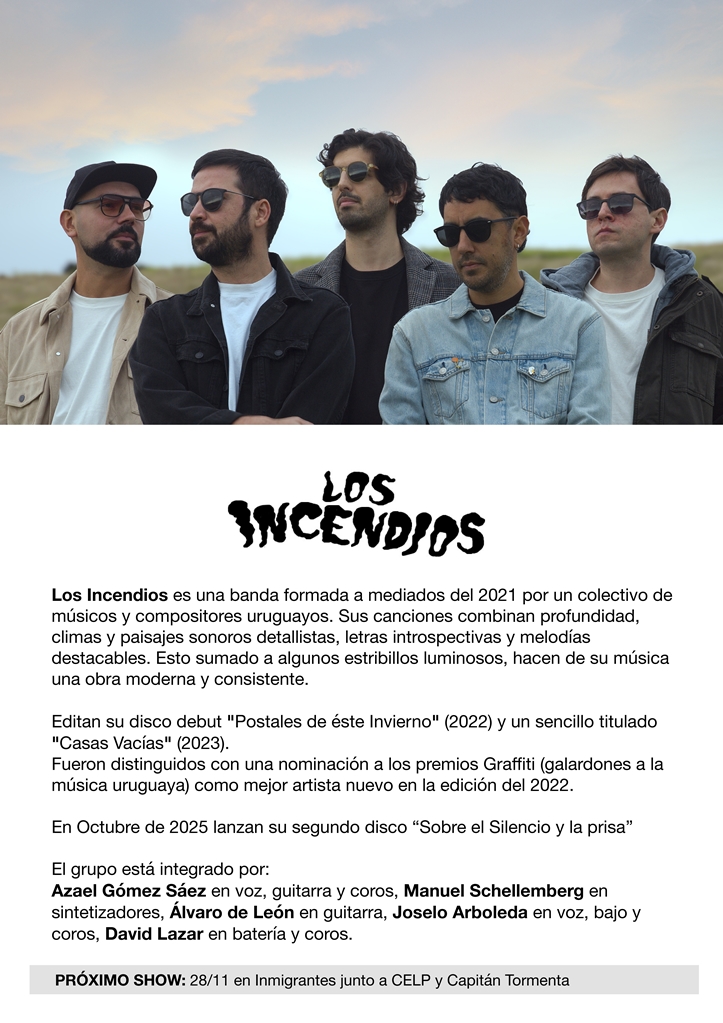 Los Incendios es una banda formada a mediados de 2021 por un colectivo de músicos y compositores uruguayos. Sus canciones combinan profundidad, climas y paisajes sonoros detallistas, letras introspectivas y melodías destacables. Esto sumado a algunos estribillos luminosos, hacen de su música una obra moderna y consistente.