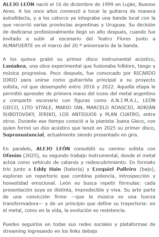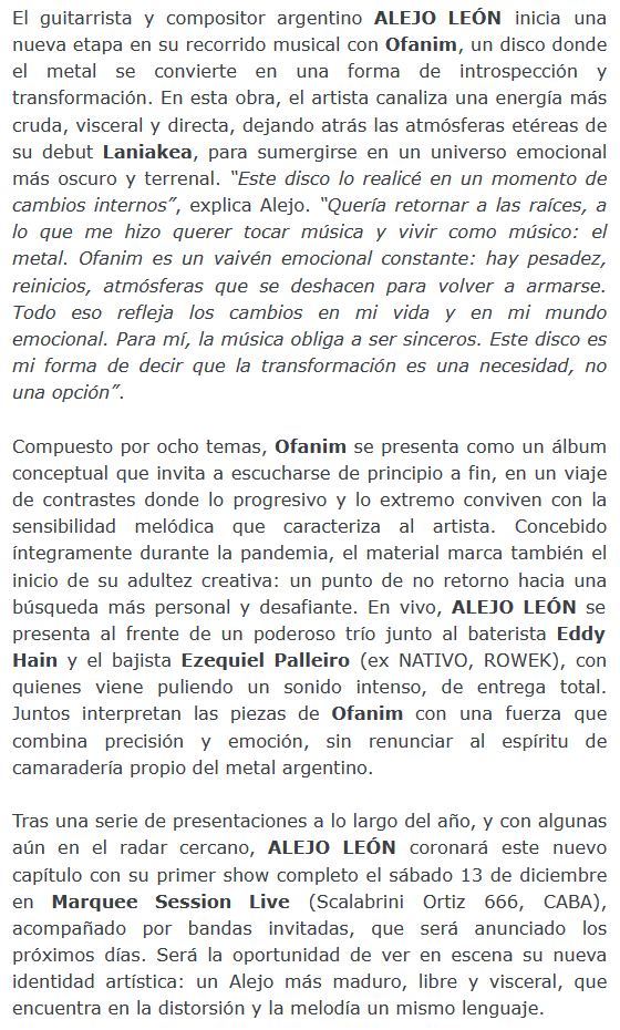 Alejo León está presentando su último disco, Ofanim. En él, su propuesta va por el lado del metal, donde el guitarrista y compositor argentino parece sentirse muy cómodo. A continuación, pueden escuchar las ocho canciones que componen el disco.