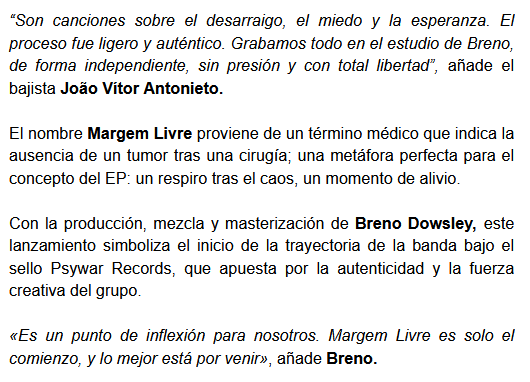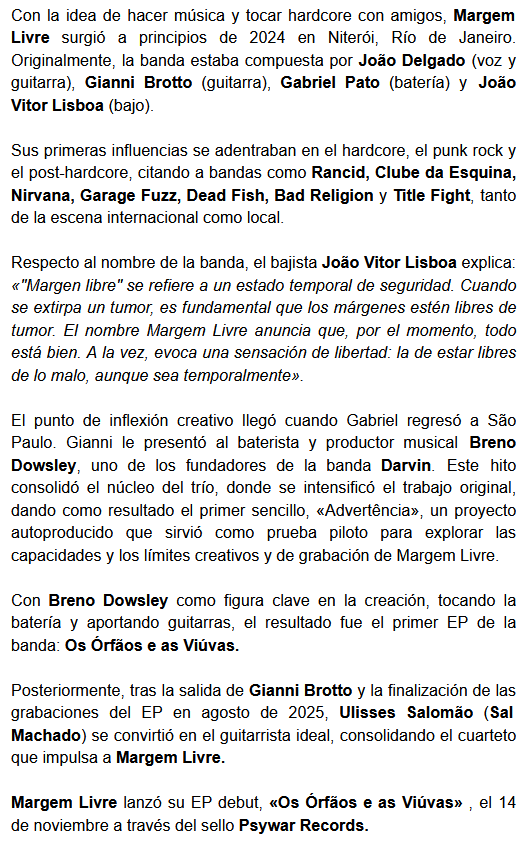 Margem Livre es la banda brasileña que nos trae toda su potencia para que la apreciemos a través de su nuevo disco, llamado Os Órfãos e as Viúvas. Se trata de su EP debut, lanzado el pasado 14 de noviembre. Pueden escucharlo a continuación.