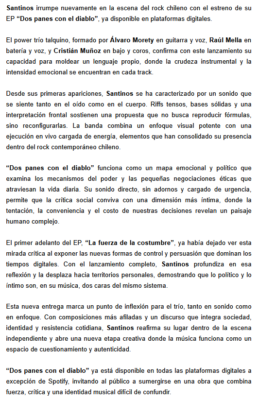 Dos Panes Con El Diablo. Así se llama el nuevo EP que la banda Santinos, proveniente de Chile, hace llegar a nuestras páginas. Está compuesto de cuatro canciones, de las cuales “La fuerza de la costumbre” ya había sido lanzada como adelanto. Compartimos, a continuación.