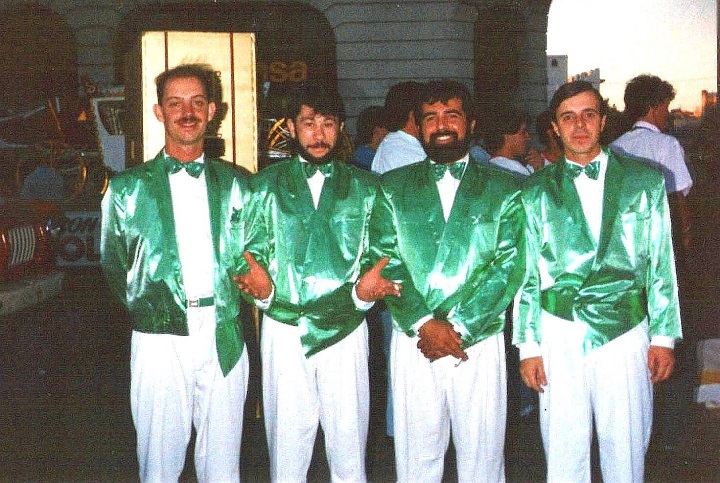 Alvin: No, Tabaré me echó (risas). Él venía de la escuela de teatro y era bastante rígido. Un día llegué tarde y me echó. Pero me tuvo que llamar de vuelta porque salían cosas. En definitiva, me quedé sólo con El Cuarteto, porque aparte de todo eso, mi hermano y sus amigos se vincularon con carnaval. Si mi idea era vivir de la música, tenía mis clases y el carnaval me prometía tocar con Los Jockers y con Los Gabys, ganando plata por tablado, como si fuera una gira pero por Montevideo. Yo no conocía mucho qué era el carnaval, pero me daba un poquito de cosa que me vistieran de colores. Tenía el tablado del Club Tabaré, que estaba cerca de casa, y cuando me llamaron para actuar ahí, dije: “¿Me va a ver todo el mundo vestido así, de naranja?”. “Pero si todas las bandas están así; vos vas a estar como todos”, me dijeron. Yo tenía un prejuicio, pero resultó que a ninguno de mis amigos le gustaba el carnaval y nadie me iba a ver, así que ahí era otro mundo. Pero bueno, se ganaba bastante bien, por lo menos para un chico que no hacía nada. Me pasaron cosas relindas: cambié el instrumento, mejoré mi salita.