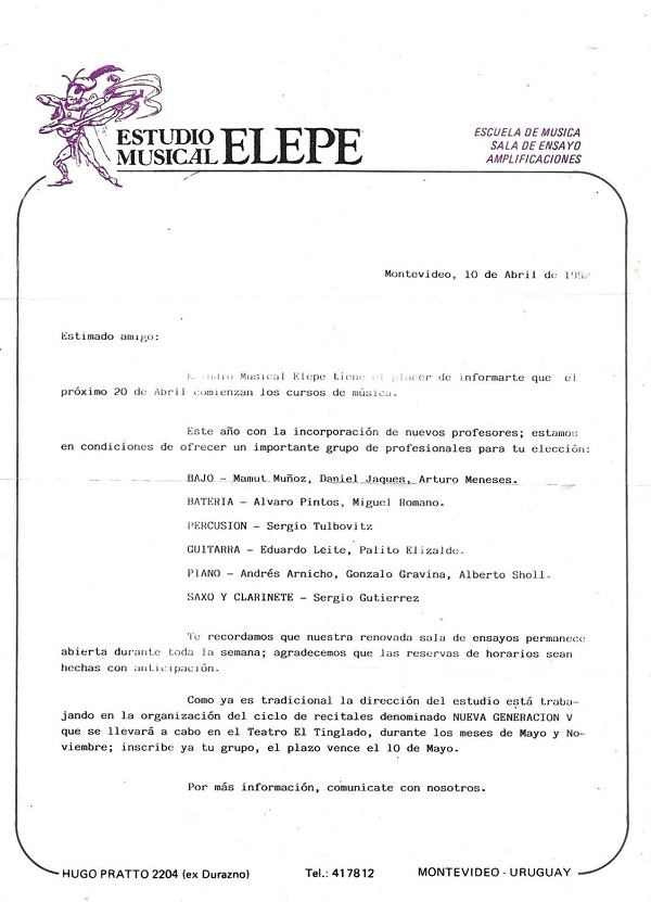 Alvin: Cuando empezamos, ensayamos mucho en mi casa donde tenía mi cuartito con la batería, o íbamos a la casa de los Musso. Con ellos me vinculé con otro mundo, mezcla de canto popular, mezcla de rock, porque ellos también se habían presentado en Estudiantina, pero yo les había ganado con Manti (risas). Ellos estaban muy vinculados con el canto popular, con otro tipo de humor, el humor negro de esa época, que evitaba las censuras más fuertes. Todo era como con un segundo sentido, había que tener mucha inteligencia para escribir y que no te censuraran. En la casa de los Musso aparecía gente, como Javier Silvera o Darnauchans, y un día apareció un tipo que estaba con un grupo. Me dicen si quería tocar la batería con ellos también, porque con El Cuarteto tocábamos muy poco. Era Tabaré, que quería hacer unos temas que tenía, porque hacía un teatro con música, y entonces armó La Tabaré. Quedé junto con Riki, que era el bajista. Empezamos a tocar en el Teatro Circular todas las semanas. Al teatro en dictadura iba muy poca gente, y los del Circular estaban encantados con Tabaré porque se llenaba la sala. Para mí era maravilloso. En esa época era muy fácil compartir dos bandas.