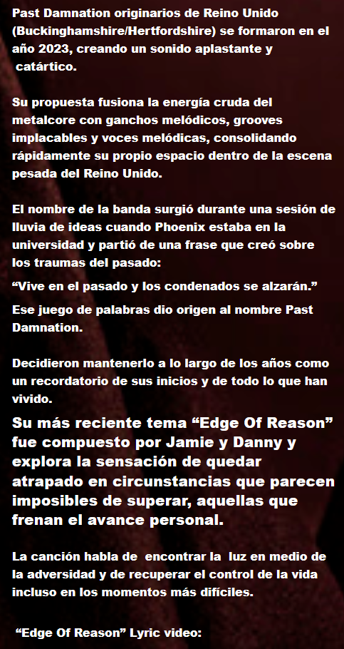 Past Damnation son originarios de Inglaterra, y traen hasta nuestras costas su poderoso sonido. Un buen ejemplo de esto es su último lanzamiento, el simple “Edge of reason”, el que pueden escuchar a continuación, mientras leen la información.