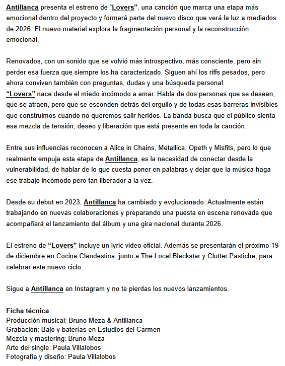 Vuelve el rock con procedencia chilena. Ahora suena Antillanca, que nos trae su simple llamado “Lovers”, que será parte de su próximo disco. Acompañan el lanzamiento con un diferente video lyric, que compartimos a continuación, junto a la música y la información.