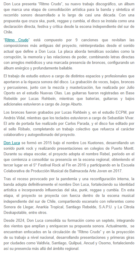 Don Luca, la banda rockera chilena, nos trae su nuevo disco, llamado Ritmo Crudo. Está compuesto por nueve canciones que traen sonidos punk y ska, con la característica de que son nuevas versiones de viejas canciones. Compartimos.
