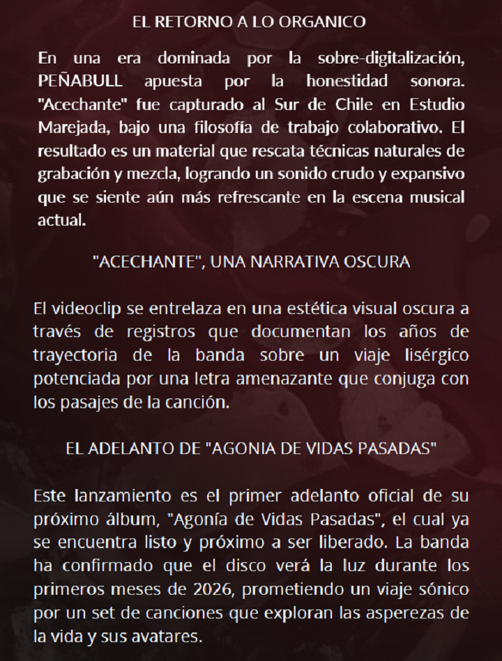 Peñabull viene desde Chile, y lo hace con potencia. El tremendo sonido que presentan con su canción “Acechante” así lo demuestra. El tema oficia de adelanto de su próximo disco, Agonía De Vidas Pasadas, y cuenta con un video que lo acompaña. Compartimos.