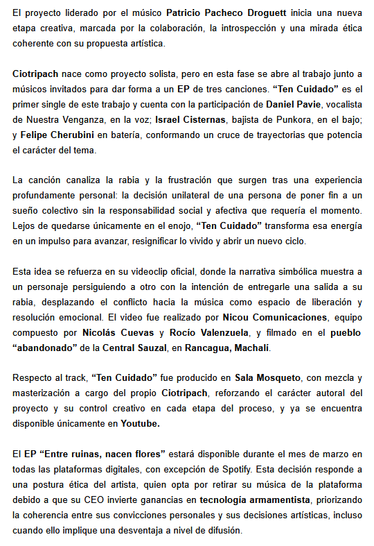 Patricio Pacheco Droguett es el músico chileno responsable del proyecto Ciotripach, que está presentando el primer tema de lo que será su próximo EP. La canción se llama “Ten cuidado” y el disco Entre Ruinas Nacen Flores. Compartimos la información y la música.