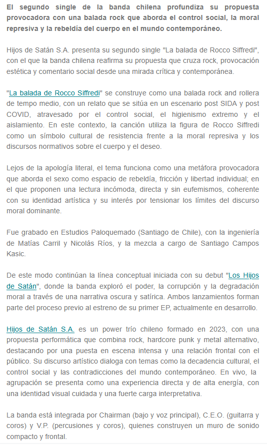 Desde Chile llega hasta Uruguay la banda Hijos De Satán S.A. Están presentando el tema “La balada de Rocco Siffredi”. Mucha potencia y rock en este segundo simple, que ya puede ser escuchado. Compartimos la información y la música.