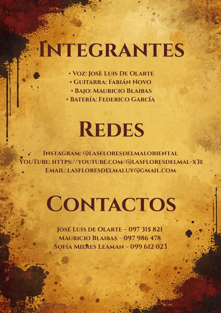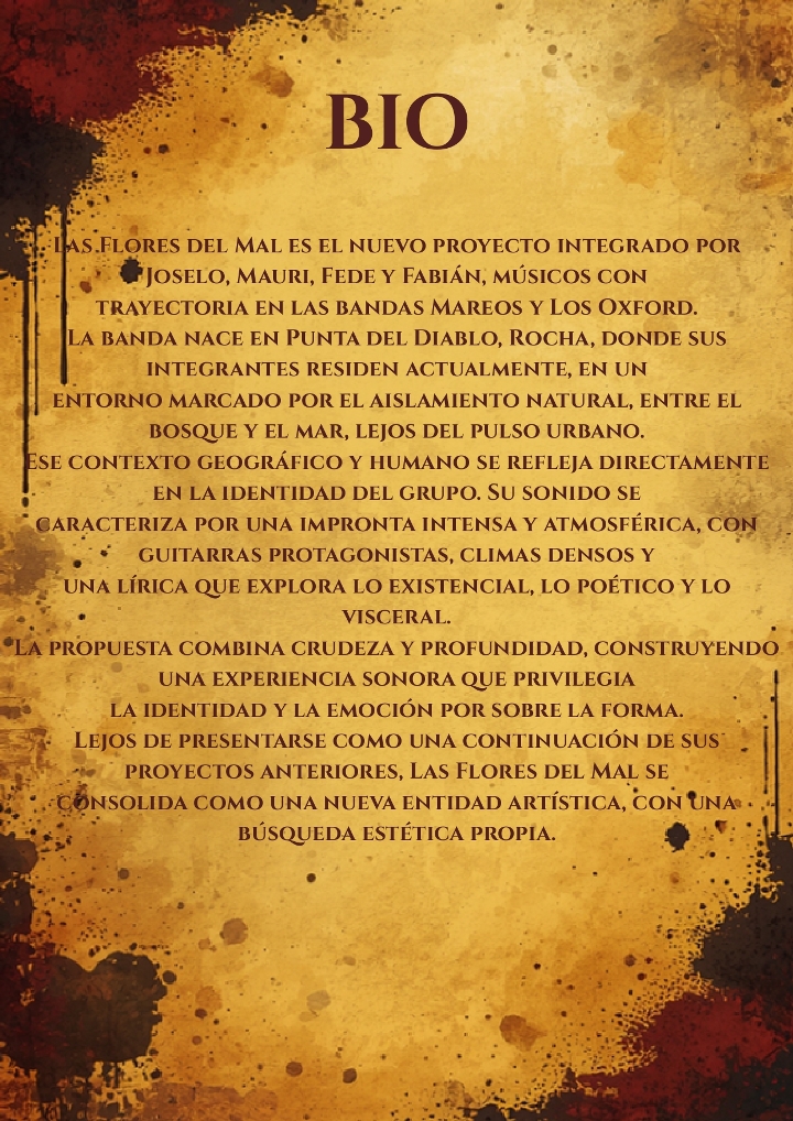 Las Flores Del Mal es el nuevo proyecto integrado por Joselo, Mauri, Fede y Fabián, músicos con trayectoria en las bandas Mareos y Los Oxford. La banda nace en Punta del Diablo, Rocha, donde sus integrantes residen actualmente, en un entorno marcado por el aislamiento natural, entre el bosque y el mar, lejos del pulso urbano.