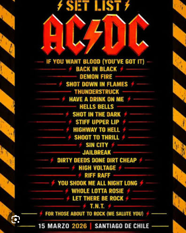 Ya sabemos que AC/DC tiene poco margen para innovar en sus distintos set list de las giras. De las 22 a 24 canciones que conforman los distintos repertorios, sabemos que cinco son del disco Back In Black, más otras cinco que son las fijas del final, “Let there be rock”, “TNT”, “Whola lotta Rosie”, “Highway to hell” y “For those about to rock”.