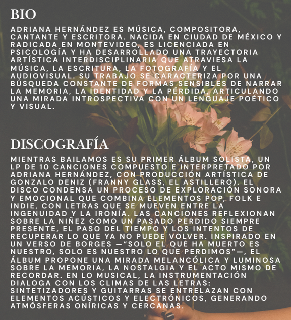 Mientras Bailamos se llama el álbum solista debut de la artista Adriana Hernández, compuesto de 10 canciones. El disco condensa un proceso de exploración sonora y emocional que combina elementos pop, folk e indie, y ya se encuentra disponible para su escucha digital.