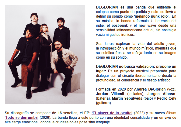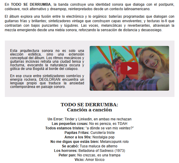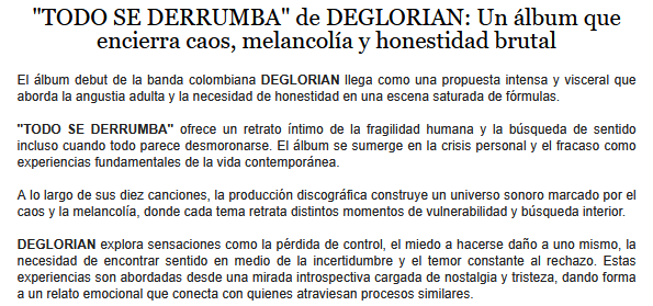 Deglorian, la banda proveniente de Colombia, nos trae su primer álbum luego de las ediciones de varios simples y un EP. El álbum se llama Todo Se Derrumba, y sus 10 canciones son un muy buen aporte para descubrir a esta banda. Compartimos la información y la música.