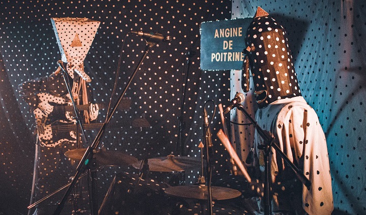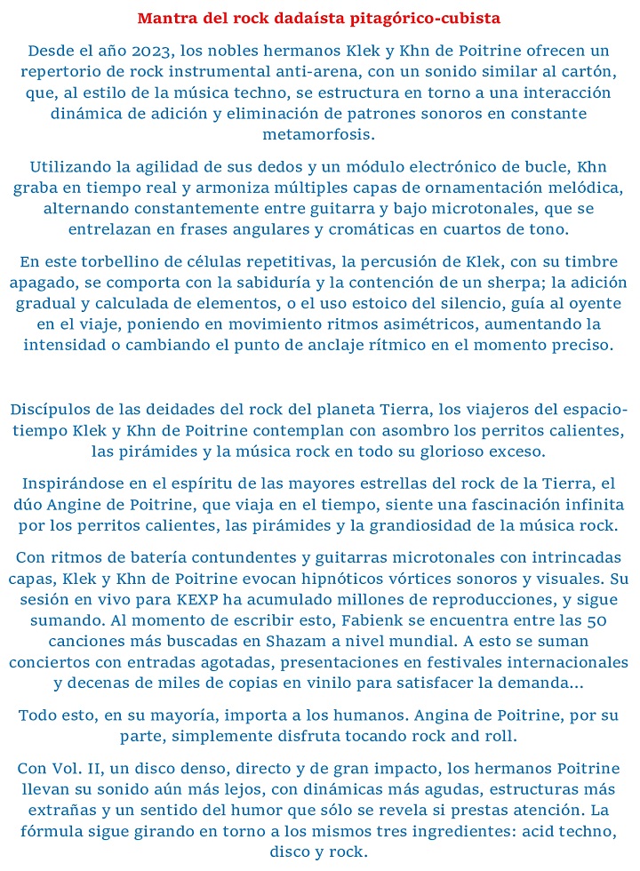 Angine De Poitrine (Angina De Pecho) es un dúo de rock experimental originario de Quebec, Canadá, que se formó en 2019. Sus integrantes son anónimos y se identifican como Khn de Poitrine (el guitarrista) y Klek de Poitrine (el baterista).