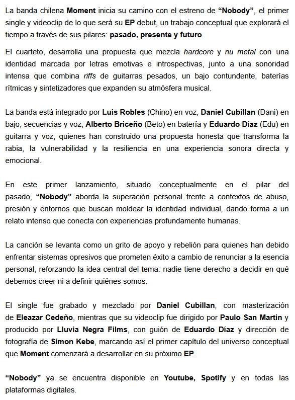 A modo de adelanto del próximo EP debut de la banda chilena Moment, están presentando el tema “Nobody”, que será parte del mismo. Acompañan el lanzamiento con un video. A continuación, compartimos la información y la música.